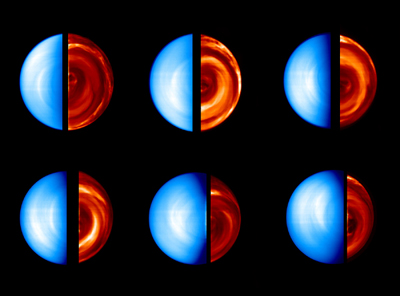 while the right image obtained in the night-side of Venus lets peer into the inner hot levels of